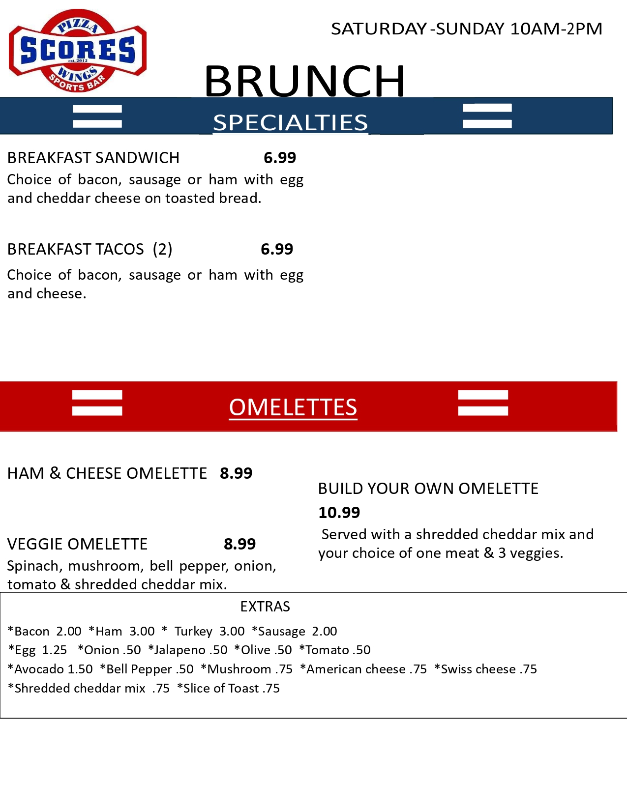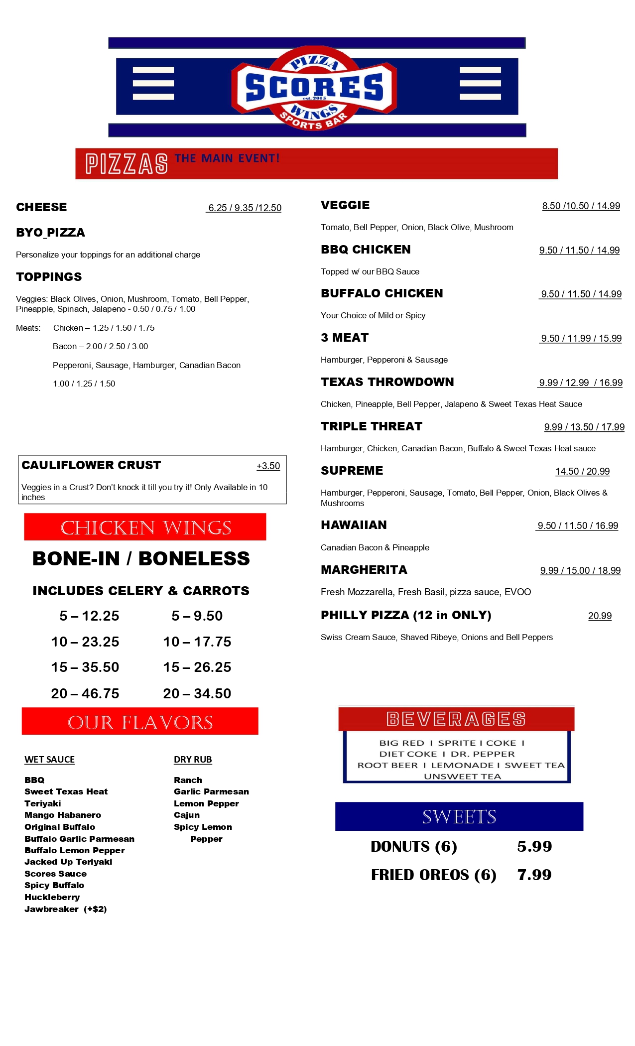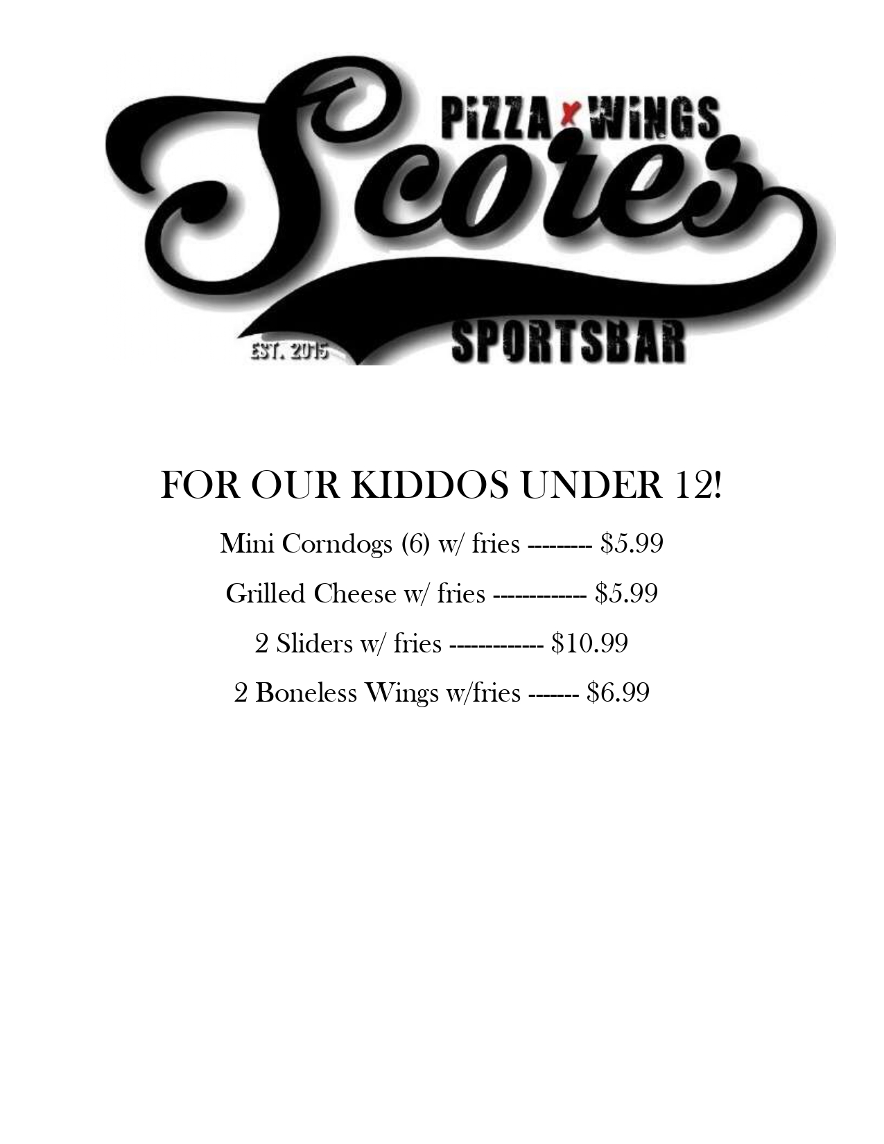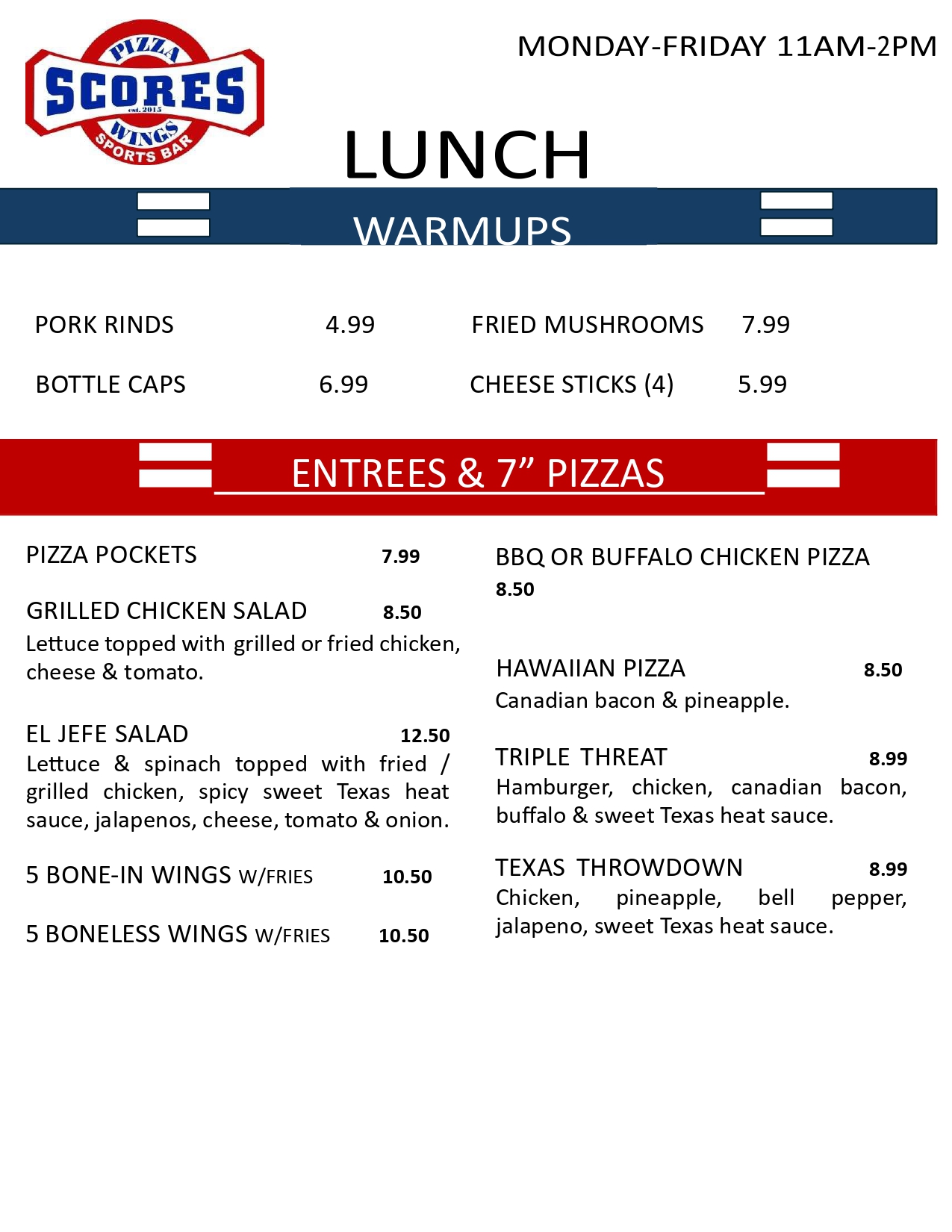 Mondays: $1 off all appetizersTuesdays: $2 off any 10" pizzasWednesdays: $1 bone-in AND boneless wingsHappy Hour: Sunday - Thursday 2pm - 6pm