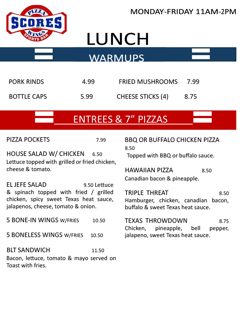 Mondays: $1 off all appetizersTuesdays: $2 off any 10" pizzasWednesdays: $1 bone-in AND boneless wingsHappy Hour: Sunday - Thursday 2pm - 6pm